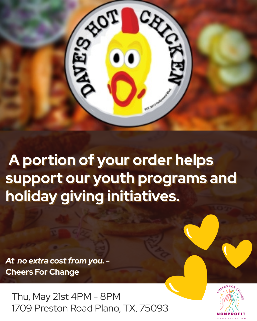 Present this flyer in-restaurant or use the online code for online/app orders, and 20% of the proceeds will be donated to Cheers for Change.